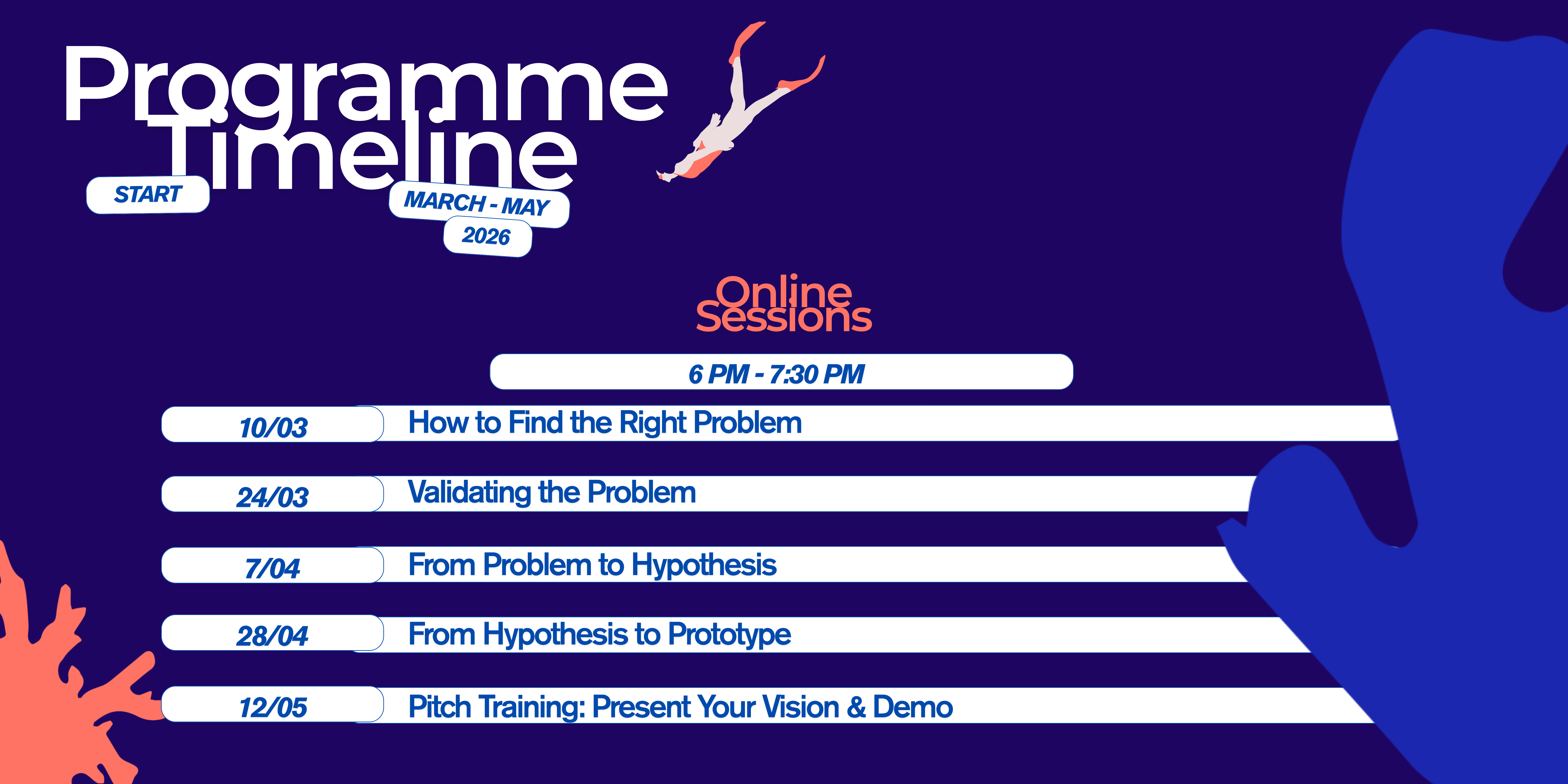 The programme consists of online themed sessions from 6 pm to 7:30 pm, including interactive masterclasses by experts and entrepreneurs testimonials on different topics such as How to Find the Right Problem, Validating the Problem, From Problem to Hypothesis, From Hypothesis to Prototype, a Pitch Training.